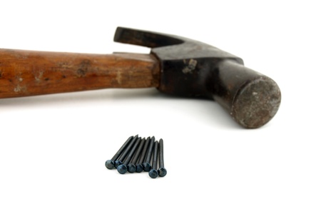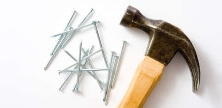 Hammer and nails on a white background with space for text.
