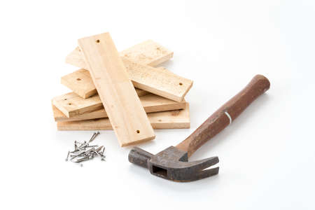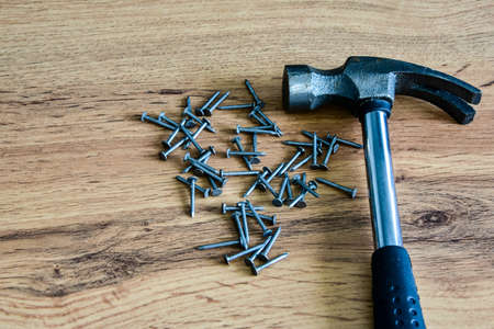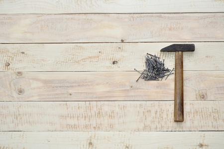 Hammer and nails on wooden background, wood and rust head iron hammer lying on wooden board with outdoor workshop.