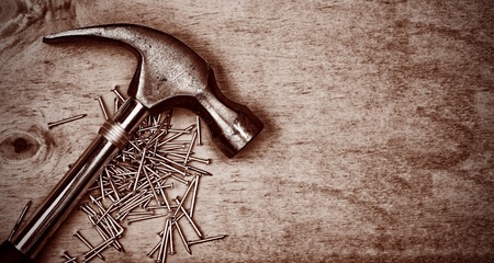 Hammer and nails over a wood panel with space for text in dark sepia shades