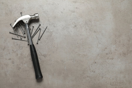 New hammer and metal nails on gray table. Professional construction tool