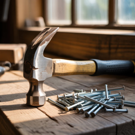 A hammer and a pile of nails rest on a rustic wooden workbench, bathed in natural light.