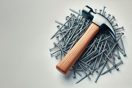 A close-up image of a hammer resting on a pile of nails with a soft blue gradient background, ideal for themes of construction and craftsmanship.