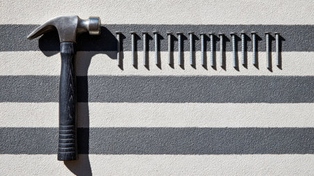 A striking overhead view featuring a hammer and nails arranged neatly on a striped background, showcasing details in craftsmanship and artistic shadow play. Perfect for DIY and home projects.