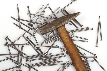 Hammers and nails on a white background.