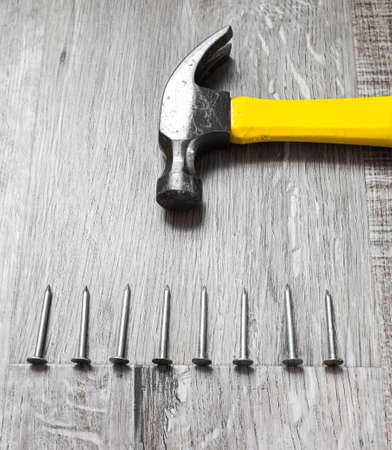 Set of silver nails aligned against yellow handy steel hammer on wooden plank floor, DIY home improvement objects. Concept of renovation, repair, woodwork, wood workshop. Vertical lines.