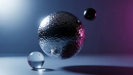 A still life of three balls made of different materials floating in air.