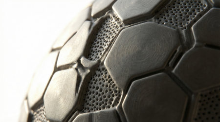 Soccer ball surface close-up reveals textured hexagonal panels and recessed perforations. Soft directional lighting emphasizes material grain, seams and subtle wear for sports equipment and product detail applications
