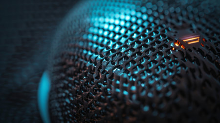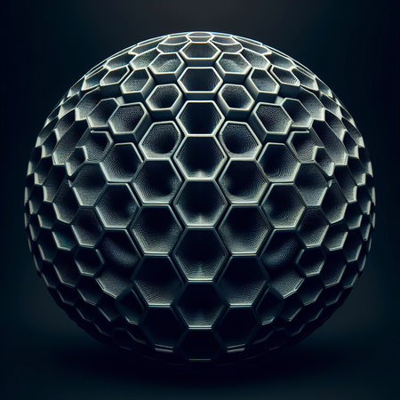 Blue metallic sphere on black background with hexagon pattern generated by artificial intelligence