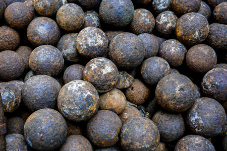 Four antique metal cannonballs or musket balls of varying sizes, arranged on a brown leather surface with a blurred vintage map in the background. Represents history, scale, and exploration.
