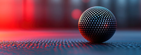 A black sphere with white dots glows with red and blue light on textured surface, creating futuristic and minimal tech atmosphere