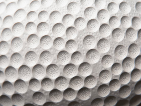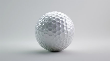 A detailed close-up of a golf ball showcasing its textured surface and subtle shadows on a smooth backdrop, creating a striking visual impact.