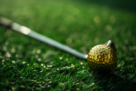 Bright golf ball on tee, shadowed by club curve generated by artificial intelligence