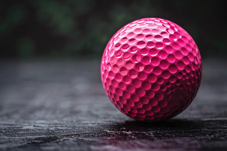 Pink golf ball resting on a dark surface with blurred green background