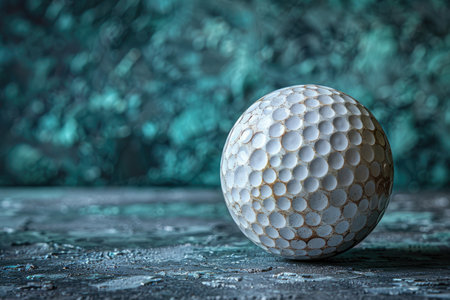 Vintage golf ball on a textured surface with a blurred teal background