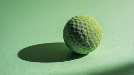 A captivating green golf ball rests on a vibrant green surface, showcasing its textured design and soft shadow, presenting a minimalist yet striking sports composition.