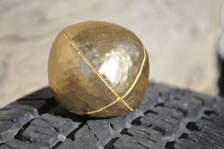 Gold juggling ball on a tire
