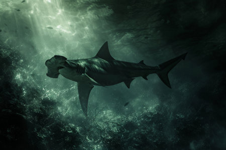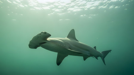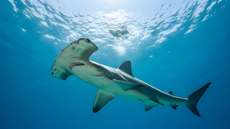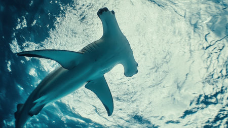 An awe-inspiring view of a hammerhead shark gliding gracefully beneath the ocean's surface, showcasing the beauty of marine life in its natural habitat.