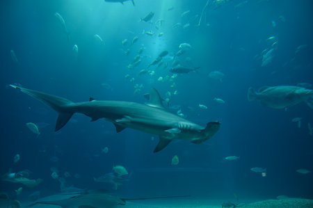 Hammerhead Shark and other fish swimming in blue water at Osaka Aquarium Kaiyukan