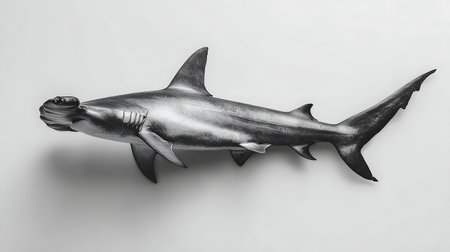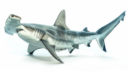 A close-up of a hammerhead shark with its unique head shape and streamlined body, sharply defined against a white background