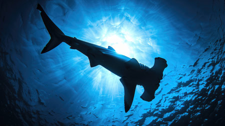Silhouette of a hammerhead shark swimming underwater against bright sun rays in the ocean