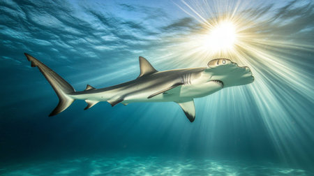 A stunning hammerhead shark glides gracefully through crystal-clear ocean water, illuminated by beams of sunlight, capturing the essence of marine beauty.