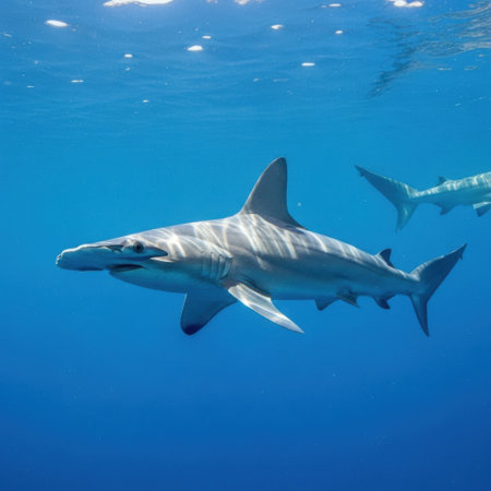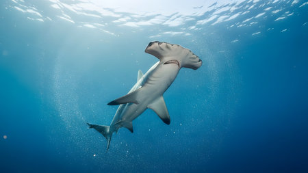 A magnificent hammerhead shark swimming through the deep blue ocean water. The shark's unique head shape and streamlined body are clearly visible as it glides effortlessly in its marine habitat.