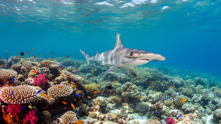 A hammerhead shark swimming gracefully over a colorful coral reef in clear blue water. The scene captures the unique profile of the predator amidst a vibrant marine ecosystem.