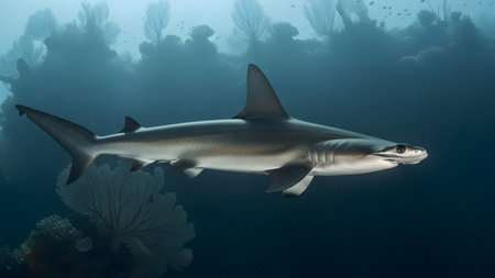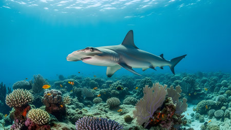 A stunning hammerhead shark glides gracefully through a colorful coral reef, showcasing the vibrant underwater ecosystem and serene ocean depths.