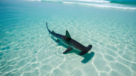 A stunning image of a majestic shark swimming gracefully beneath the ocean surface, showcasing its powerful fins and unique head shape in crystal clear water.