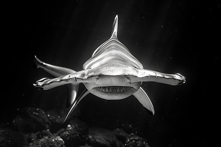 Digital artwork of black and white photography of a hammerhead shark in the dark, minimalistic style.