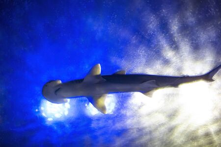 Hammerhead shark swimming in deep blue water view from below. Selective focus on the shark backlit in an aquarium