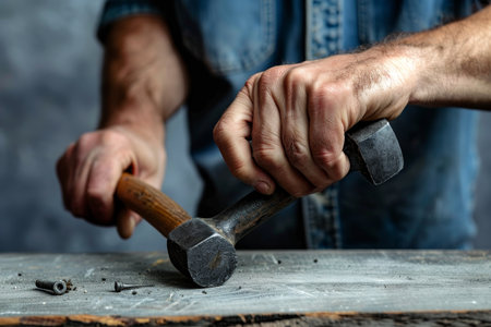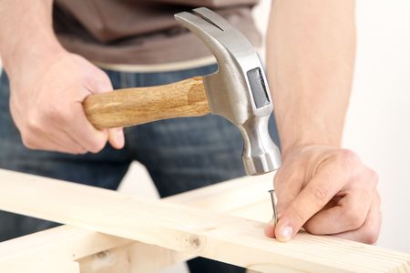 Close-up of a carpenter using a hammer to nail a nail into a wooden board