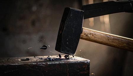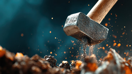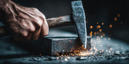 A hammer strikes metal on an anvil, causing debris to fly in the air, illuminated by warm workshop lighting, capturing the intensity of forging.