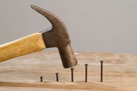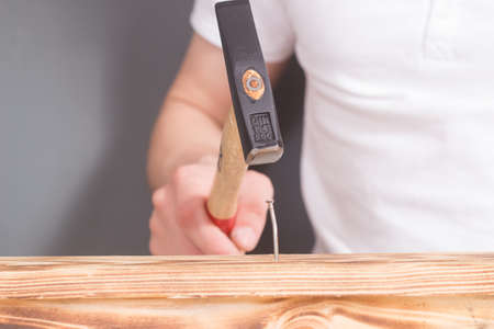 A carpenter hit a nails into an old wood stick in workshop. DIY concept.