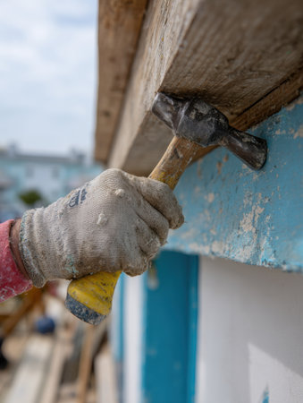 A construction worker applies force with a hammer to secure wooden beams in a renovation project near the coast, surrounded by tools and materials.
