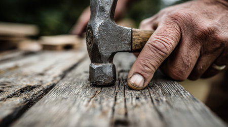 A hand grips a hammer, striking down on a wooden board, showcasing craftsmanship and focus on a woodworking task outdoors in the afternoon.