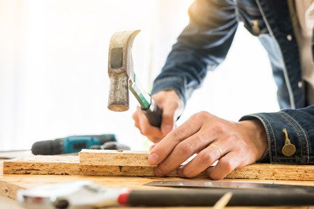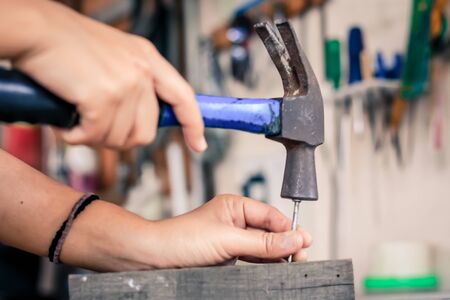 Close-up the carpenter hit nail to wood chip in workshop. DIY concept.