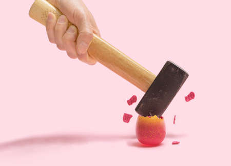 Minimal destruction concept. Male hands strike with massive hamer little glitter pink colored eggs. Beautiful pink background