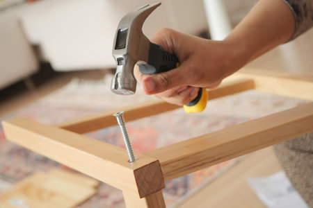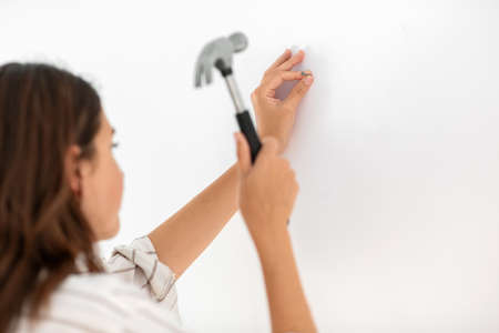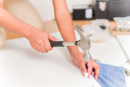 Latin Bolivian strong and independent success woman assembly and repair furniture with hammer.