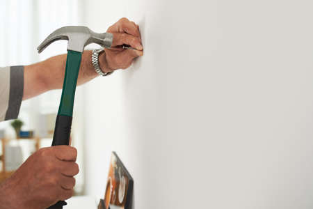 Man hammers a nail into a black wallpaper wall. Close-up of hands with a construction tool. DIY concept, husband for an hour.