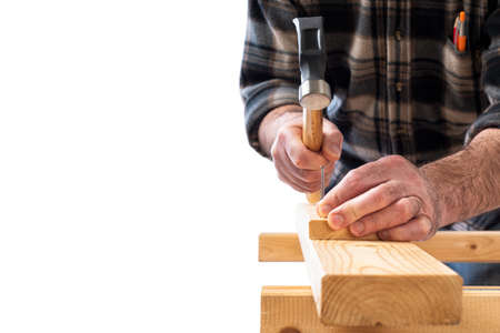 Close-up. Carpenter with hammer and nails fixes a wooden board. Construction industry, do it yourself. White background.