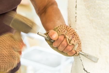 High angle close up shot of unrecognizable tile worker holding hammer breaking piece of marble to create mosaic , copy space