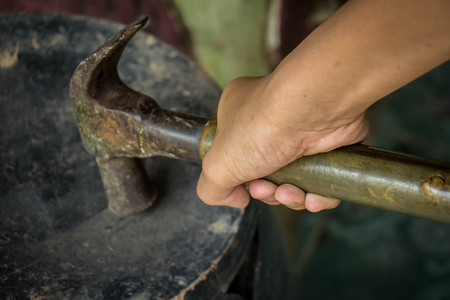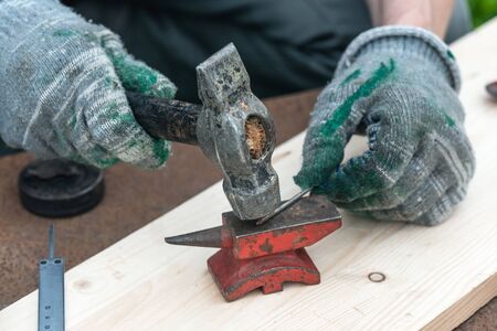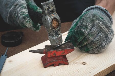 Worker is straightening a nail by hammer on a anvil on his workbench.