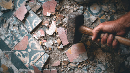 A detailed image showing a hand gripping a hammer, breaking colorful and decorative floor tiles while debris scatters across the surface.