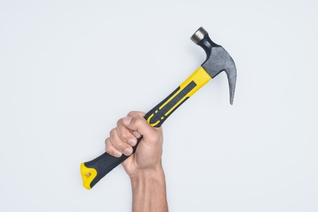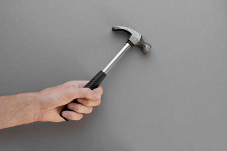 Close-up of man hands holding hammer. Concept of repair and renovation.