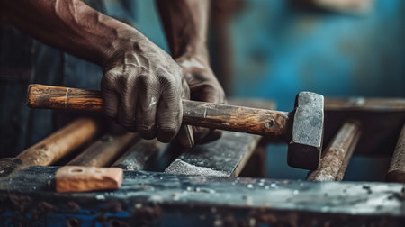 Close-up of a skilled craftsman's hands holding a hammer, ready to shape metal on an anvil in a workshop.