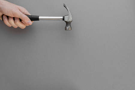 An iron hammer hangs over an empty space on a gray background. Free space for text.