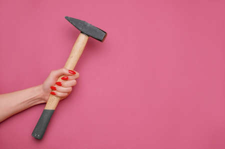 Repair concept. Female hand holds a screwdriver and a hammer on blue studio background.