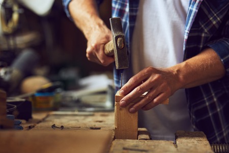 Carpenter hammering a nail into wooden plank in a carpentry shop