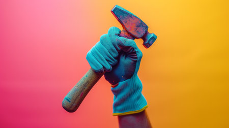 Vibrant gloved hand gripping a hammer with a blurred pastel background.